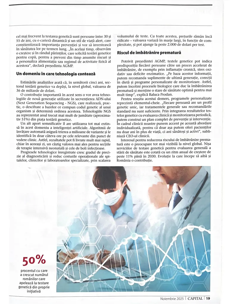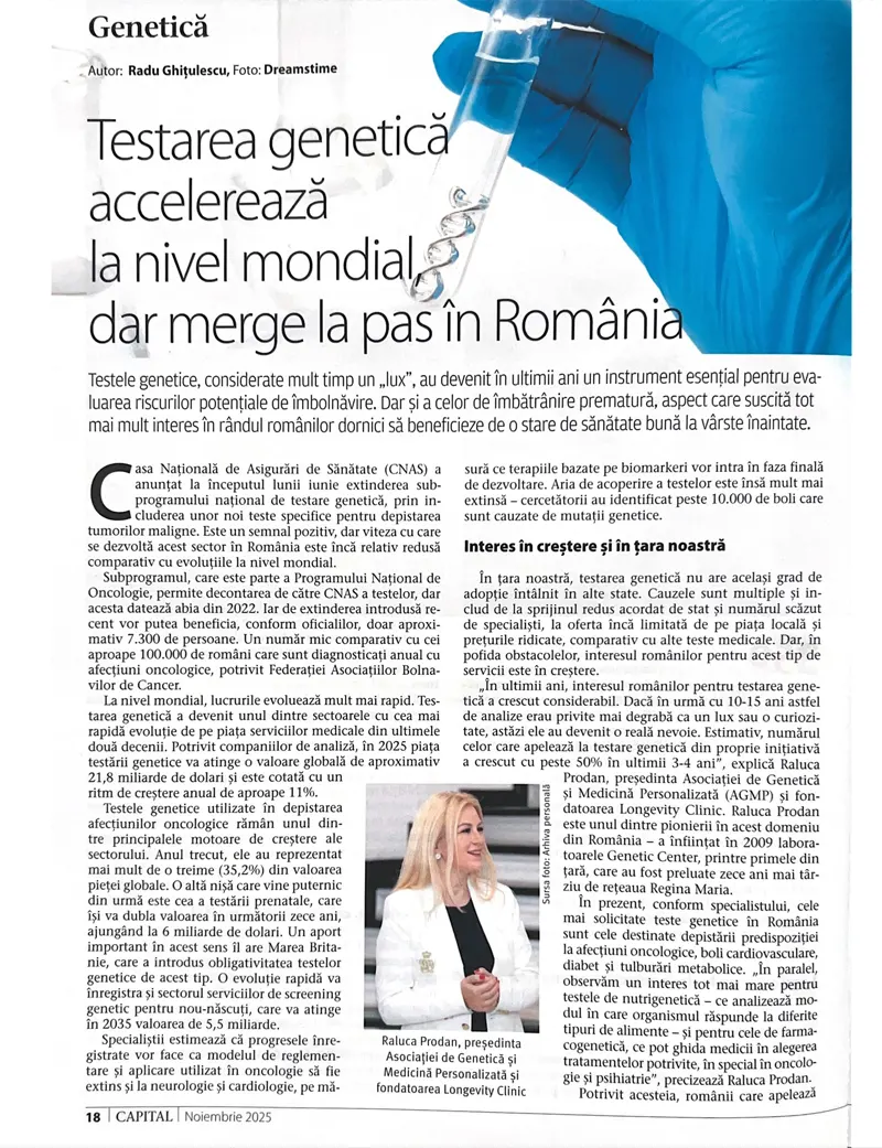Raluca Prodan fondatoarea Longevity Clinic și președinta Asociației de Genetică și Medicină Personalizată, a vorbit în revista Capital despre rolul tot mai important al testării genetice în evaluarea riscurilor de boală și de îmbătrânire prematură.
